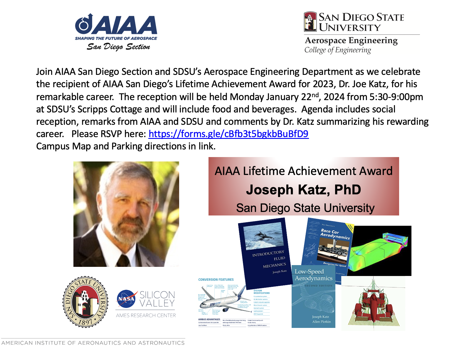 The reception will be held Monday January 22nd, 2024 from 5:30-9:00pm at SDSU’s Scripps Cottage and will include food and beverages. Agenda includes social reception, remarks from AIAA and SDSU and comments by Dr. Katz summarizing his rewarding career.