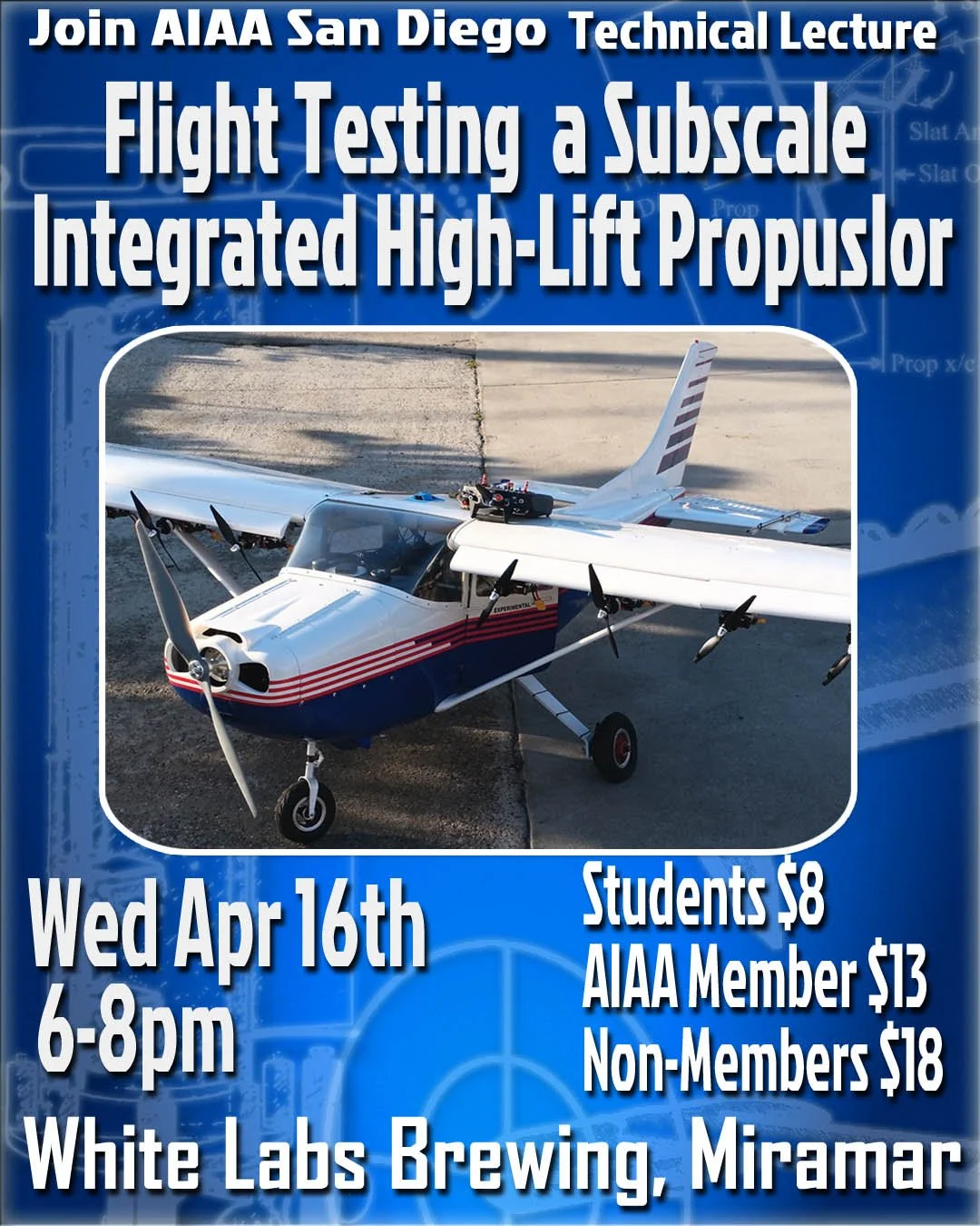 Join AIAA San Diego for an evening Technical Lecture, from Member Byron Ward of Wayfarer Aircraft Research & Development, on his most recent paper “Flight Testing Instrumentation Development and Integration for a Subscale Integrated High Lift Propulsor Testbed”. Flight and wind tunnel testing was performed to evaluate the performance of the Integrated High Lift Propulsor (IHLP), a novel Distributed Electric Propulsion (DEP) system.